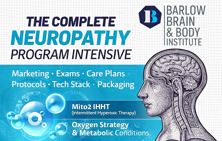 Two-day intensive to build a complete, scalable neuropathy program. We cover Marketing, Exams, Care Plans, Protocols, Tech Stack, and Packaging—plus how to integrate Mito2 IHHT oxygen cycling to support mitochondrial & metabolic function.